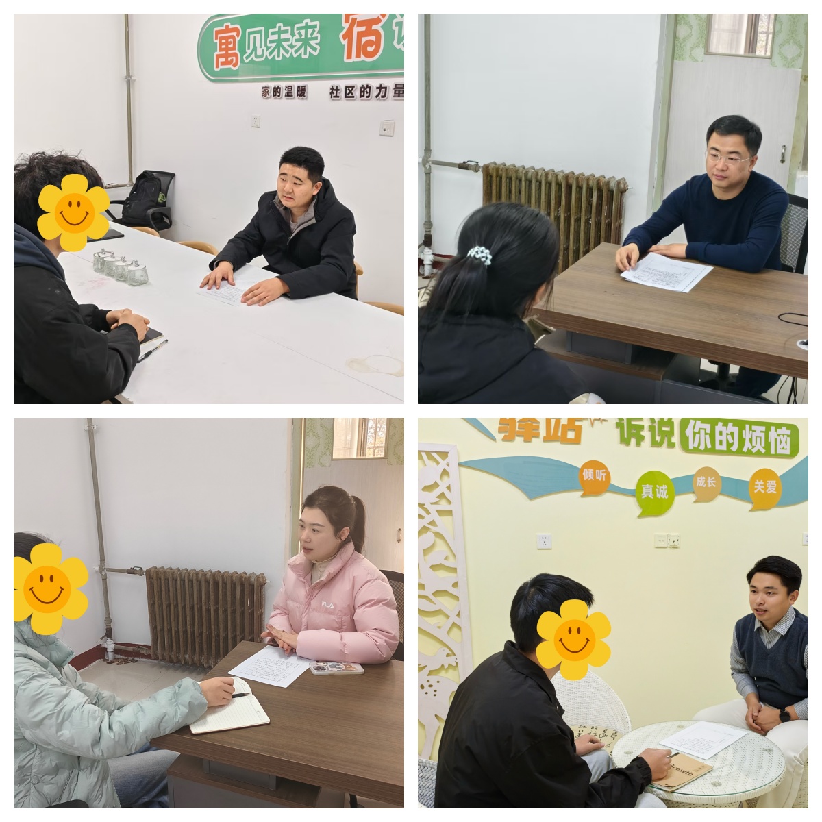 交流中,刘永欣针对学生因经济压力产生的学业顾虑,分享实用学习方法与课程指导,并引导学生树立理性消费观念,做好日常支出管理。王岱龙通过一对一交流回应学生具体关切,结合成长发展需要,帮助学生缓解因经济压力带来的社交顾虑。曲红红以平等亲切的方式与同学们交流,倾听大家在考前调适、生活适应等方面的压力,分享情绪管理与时间安排方法,鼓励通过参与校园实践提升综合素养。贾文斌系统讲解预习、复习与解题技巧,帮助构建个人学习节奏;同时针对人际沟通实际难题,结合具体情境提供沟通建议,助力学生提升表达与协作能力。