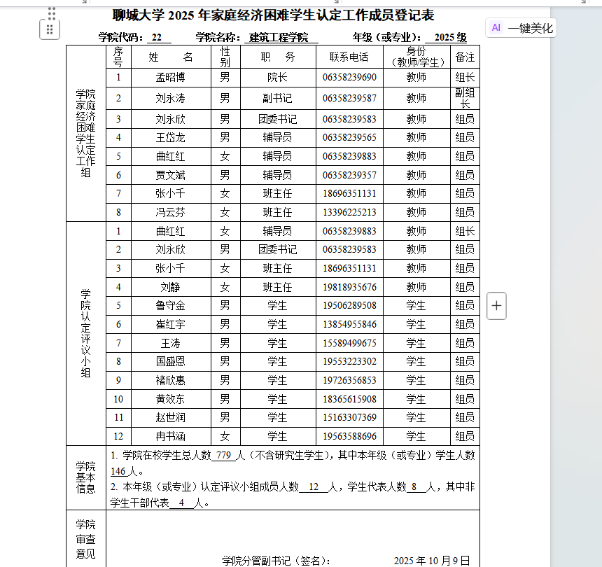 为切实做好我院2025年度家庭经济困难学生的认定工作,结合我院实际,成立以院长为组长,分管学生工作的副书记为副组长,团委书记、辅导员、班主任为成员的学院家庭经济困难评议小组,成立以辅导员为组长,班主任,学生代表担任成员的班级小组,严格把控学生的真实情况,真正做到为同学服务。