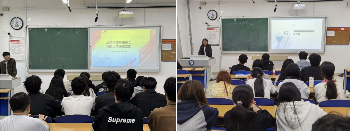 讲座上,张振勇结合自身考研逆袭的经验,首先强调了明确考研目标的重要性,建议同学们结合自身兴趣和职业规划选择院校与专业。随后,他详细介绍了自己的备考时间表,并分享了高效复习的技巧。在谈到心态调整时,他结合自身经历说道:“备考过程中难免会遇到压力和挫折,但坚持和自信是成功的关键。每一次克服困难,都是离梦想更近一步。”张娴以自身成功保研的经历为主线,围绕大学生活中的学业发展、竞赛实践与心态调节三方面展开系统性分享。她详细阐述了日常课程的高效学习策略与期末复习的阶段性规划方案,如何去准备竞赛,最后张娴提醒同学们不要随波逐流,要保持自己的节奏感。