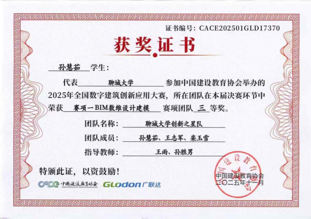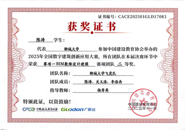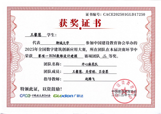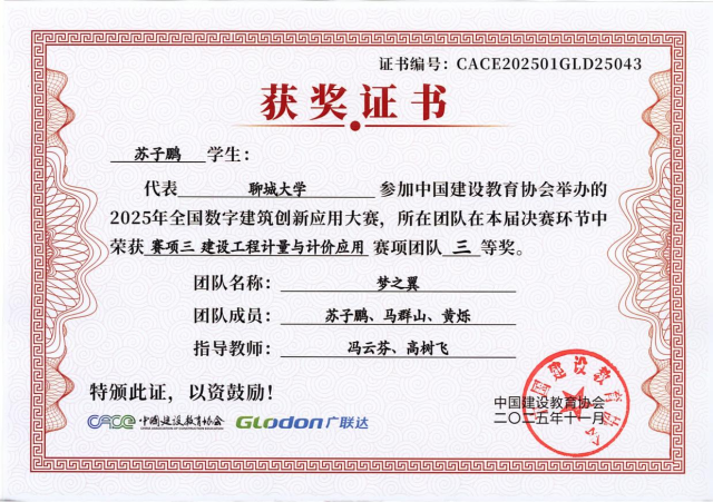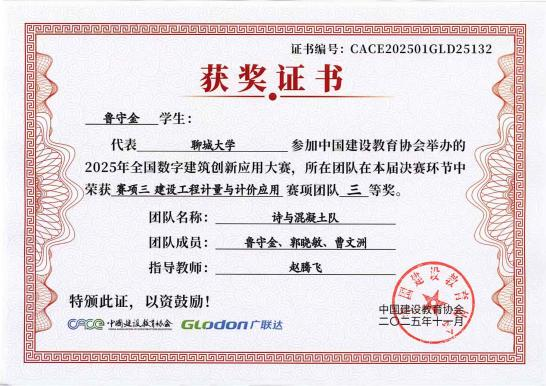 恭喜我院2023级优秀学生陈涛、2023级优秀学生王馨慧、2024级优秀学生孙慧茹在2025年“全国数学建筑创新应用大赛”中,荣获团队二等奖。2023级优秀学生鲁守金、2023级优秀学生苏子鹏荣获团队三等奖。