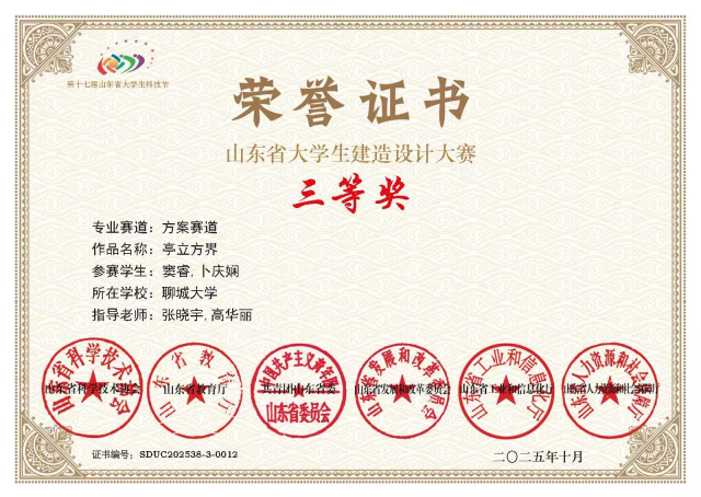 恭喜我院2022级优秀学生窦睿在第六届“山东省大学生建造设计大赛”荣获团队三等奖。