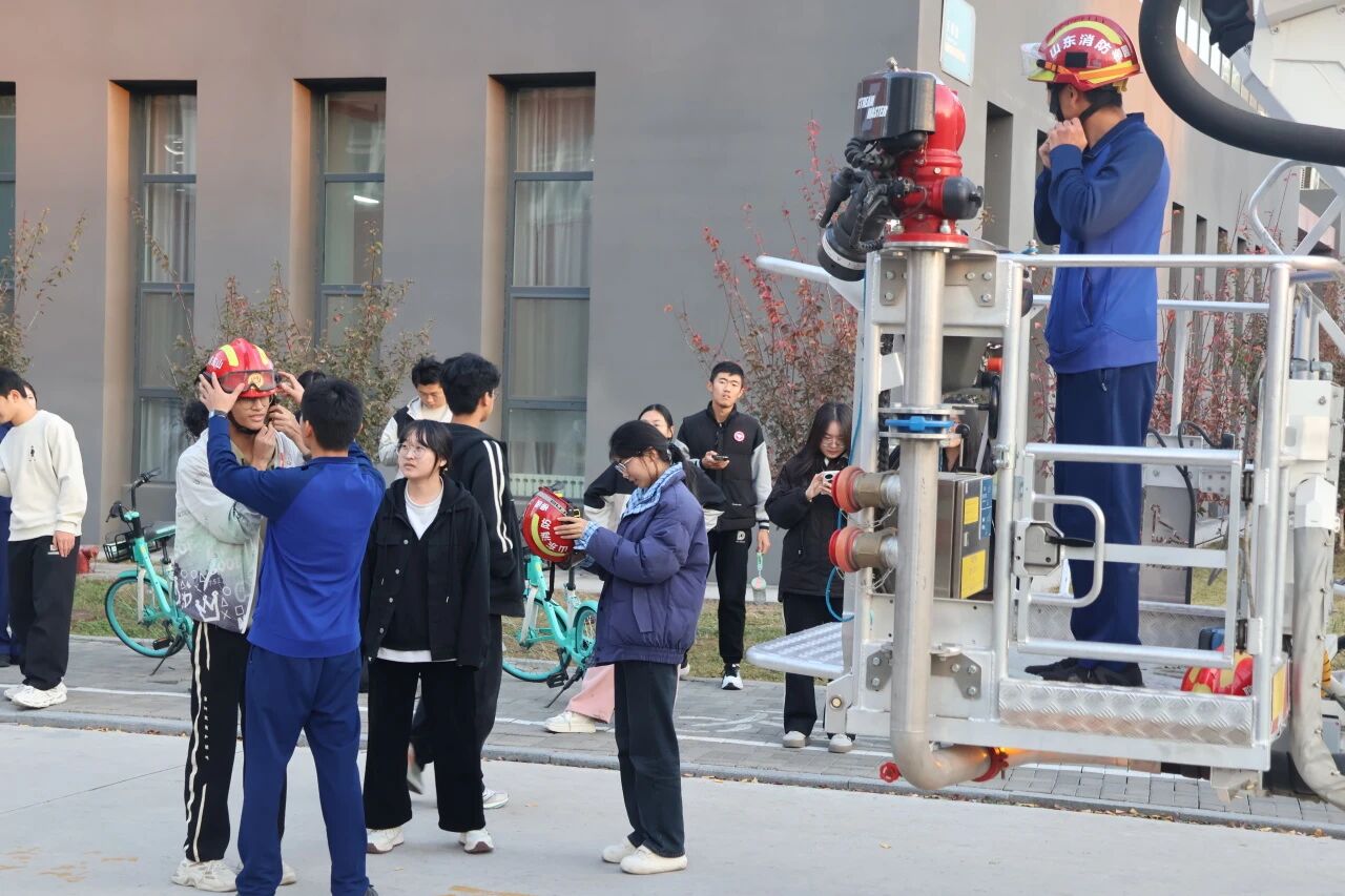 在实操教学环节,沈琳紧密结合灭火器的构造与灭火原理,对“提、拔、握、压”这一四字使用口诀进行细致拆解演示,使师生能够直观地掌握操作要领。随后,消防员带领师生近距离参观消防车及各类消防装备,并组织同学们体验云梯登高作业。同学们依次登上云梯,亲身体验高空作业的视角。消防员全程守护在旁,同时详细讲解云梯的操作原理、安全注意事项以及实战应用场景。在互动答疑环节,同学们积极踊跃地提问,消防员针对同学们普遍关心的问题进行了详细解答,确保每位同学都能掌握实用的消防安全知识。