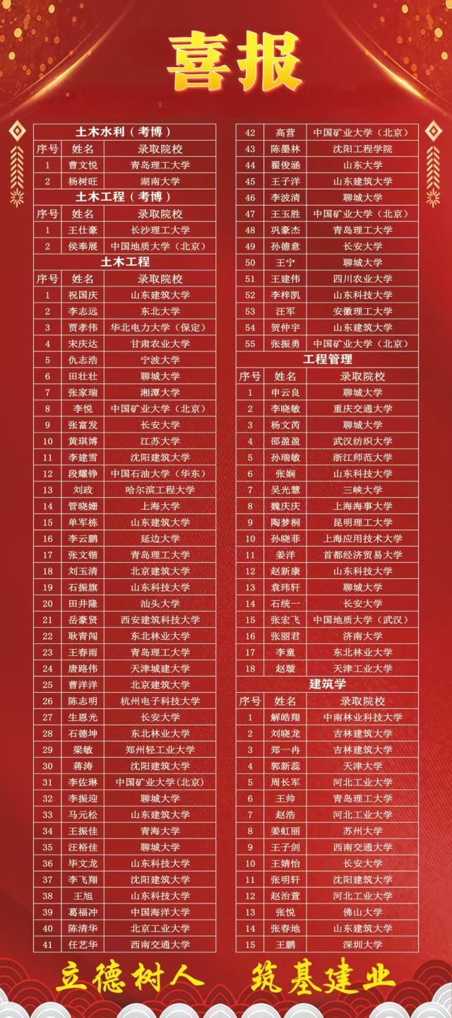 近日,2025年全国硕士研究生统一招生考试录取工作顺利落幕,建筑工程学院2025年考研再创佳绩。学院2025届本科毕业生共257人,其中90人顺利录取硕士研究生,深造率达36%。同时,本届硕士研究生毕业生中有4人成功考取博士研究生,创历史新高,实现了高层次升学的重大突破,人才培养成效显著。